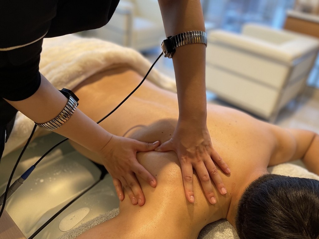 直後でも肩の盛り上がりがなだらかになっています、痛みなく一瞬でほぐれてしまう優秀な最先端マシンを駆使。
